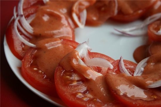 STEAKHOUSE TOMATO SALAD Источик: marthastewart.com ![]() 4 порции 3 ст.л. олив масла 2 ст.л. яблочного уксуса 2 ст.л. кетчупа 1 ч.л. сахара 1 ч.л. молотой паприки 1/2 ч.л. вустерского соуса (Worcestershire sauce) крупная соль чайная ложка майонеза 2 больших помидора, порезать на толстые кружочки 1 сладкая луковица (сорт Vidalia), порезать на тонкие полукольца В баночке с крышкой смешать олив масло, уксус, кетчуп, сахар, соль, паприку и вустерский соус. Хорошо взболтать. На тарелку выложить помидоры и лук, взбрызнуть немного соусом. оставшийся соус подать отдельно. примечания этот замечательный салат взяла у IRKU с кукинга, вустерский соус я не брала-честно говоря даже не пробовала,а положила я чайную ложку майонеза-вкус стал сливочным и такой вкусный соус-отлично для мяса и вообще чего-нибудь на гриле а вот тут подумала что устричный соус подошел бы и дома есть,попробую еще раз ![]() Вустерский соус (Worcestershire sauce) - традиционная английская приправа из мелассы (черной патоки), соевого соуса, чеснока, лука, анчоусов (кильки). |