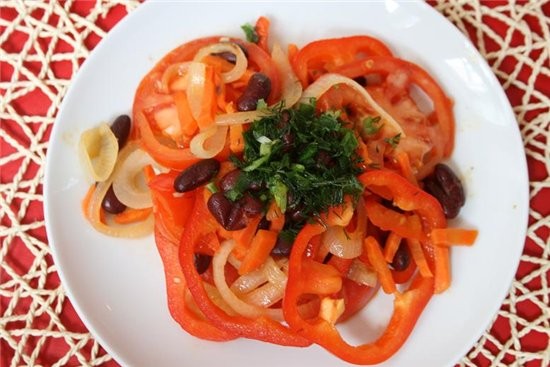 журнал вкусные рецепты ![]() 2 помидора 2 морковки 2 луковицы 2 красных паприки 1 банка консервированной красной фасоли 1 зубчик чеснока 2 ст.л. лимонного сока красный перец,соль,раст.масло,зелень 1.овощи очистить и нарезать:морковь-брусочками,перец и лук кольцами,обжарить до полуготовности(морковку можно положить раньше остальных). 2.добавить порезанные дольками помидоры,фасоль(предварительно слив сок и промыв холодной водой),измельченный чеснок,зелень,посолить,поперчить,полить лимонным соком и тушить 2-3 минуты под крышкой(я не стала закрывать чтобы выпарить жидкость) 3.блюдо подавать охлажденным примечания-суперская закуска! |