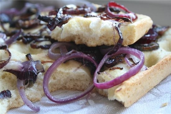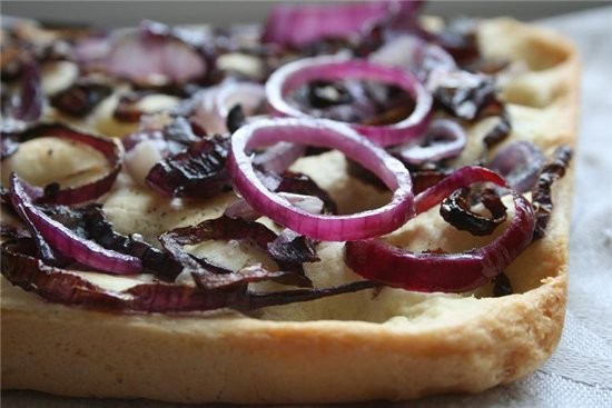 ![]() 7 г сухих дрожжей 1 ч.л. соли 250 мл воды горячей 450 г муки 4 ст.л. оливкового масла 1 ст.л. кукурузной муки 2 красные луковицы 1 ч.л. сухого розмарина,половина ч.л. горошин черного перца,крупная соль 1.смешать дрожжи,соль и 150 г муки 2.в горячую воду добавить 2 ст.л. масла и аккуратно влить в мучную смесь,все время перемешивая.постепенно добавить всю муку и 2 ст.л. масла и месить до получения мягкой и эластичной консистенции 3.закрыть миску пленкой и дать постоять 15 минут 4.смазать противень маслом и посыпать кукурузной мукой-выложить тесто на противень,разровнять руками и оставитьв теплом месте на 30 минут,закрыть пленкой,пока не увеличится в объеме в два раза 5.лук нарезать тонкими кольцами,обжарить в 1 ст.л. масла 4 минуты 6.сделать в тесте глубокие проколы большим пальцем или любой широй ручкой(у меня скалка),сбрызнуть маслом-ровным слоем выложить половину лука,горошины черного перца раздавить и посыпать лук,посыпать солью и розмарином 7.выпекать при 200 градусах 20 минут,вынуть из духовки и посыпать оставшимся луком и по желанию 2 ложками столовыми тертого пармезана |