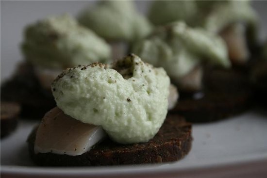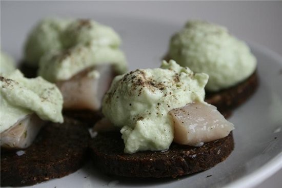 закуска с авокадо и сельдью ![]() 1 авокадо,1 селедка,соль,перец,2 ст.л. сметаны,тосты из черного хлеба 1.авокадо очистить,вынуть косточку и взбить в блендере вместе со сметаной,посолить 2.селедку очистить и нарезать кусочками 3.на хлеб уложить кусочки сельди,сверху чайную ложку мусса из авокадо,присыпать перцем примечания я брала уже филе сельди кусочками,ну а остальное быстро-и отличная закуска,можно на хлеб положить кусочек маринованного огурца или каперсы |