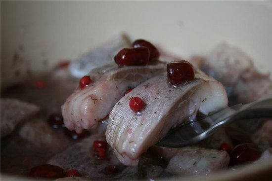 ![]() по мотивам рецепта из журнала вкусные рецепты филе соленой сельди(около 500 г) гранат 1 /3 лайм (лимон)1 штука мелко нарезанный свежий имбирь 1 ч.л. сахар 1/2 ч.л. перец черный,перец розовый оливковое масло 1 ст.л соль морская по вкусу 1.из граната и лайма выжать сок,добавить перец,соль,имбирь(у меня сушеный) сахар,оливковое масло-уложить кусочки рыбы и оставить в холодильнике на час 2.при подаче украсить зернами граната и розовым перцем |