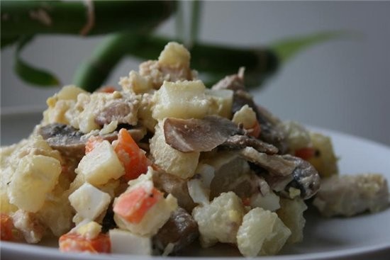 ![]() 300 гр. куриного филе 300 гр. шампиньонов 2-3 вареных яйца 5 вареных картофелин 2 вареных моркови 1 большая луковица перец,соль,майонез 1. курицу порезать тонкими ломтиками и обжарить с минимальным количеством масла,посолить 2. грибы пожарить с луком в растительном масле ,тоже посолить. 3. яйца ,артофель и морковь порезать кубиками 4. все перемешать с майонезом. Сольи перец по вкусу. примечания-где найден не помню,если кто опознает признавайтесь |