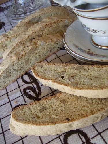 Очень давно я искала рецепт именно этих бискоти.Все что я делала до этого,было отдаленно похоже, но не то, a бискоти, которые были куплены в магазине, были похожи скорее на печенье. Бискоти, это твердые итальянские печенья сухари, которые рекомендуется размачивать в кофе перед употребелнием. В этом рецепте они получаются плотные и сухие,но не крошатся, именно такие, чтоб погрызть, как мы любим. Мой вердикт-самые вкусные бискоти, которые я (пока) пробовала. Если у вас не водится алкоголя в доме, не беда-используйте миндальную эссенцию, а можете использовать ложку готового кофе. Так же интересно заменить часть орехов сушeной клюквой или вишней, или шоколадными чипсами(для шокоголиков), орехи можо взять любые, думаю будет очень вкусно с фундуком. В общем,вариации бесконечны. Еще одно условие,как мен кажется важное,это правильная температура,духовка не должна быть горячее 150Ц(300Ф), таким образом бискоти больше сушатся, а не пекутся.