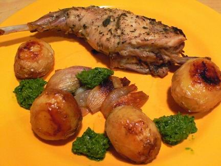 Кролик запеченый с картошкой и шалот ![]() Рецепт я собрала из трех разных: Кролика я мариновала по этому рецепту Карины с кукинга(слова автора): - 1 кролик ( вес минимум 1, 3- 1. 5 кг) - 100- 150 г копченного шпика Маринад - 1 головка мелко порубленного чеснока - 1 ст л розмарина - 1 ст л рубленного шалфея - 1 ст л тимяьна, оригано - 5- 6 штук лаврового листа - цедра полловины лимона - соль, черный перец - 5- 6 ягод можжевельника - 150 мл белого вина - Разрезать кролика по длине по животу ( не разрезая хребет) как " книжку - Порезать шпик мелкими кубиками и нашпиговать ним кролика - Смешать все " сухие " ингридиенты для маринад и натереть мясо - Выложить кролика в посуду или пакет и залить вином - Оставить мариноваться минимум на 12 часов ( лучше дольше), переодически переворачивая - Очистить кролика от специй, обсушить бумажным полотенцем, смазать растительным маслом - Запечь на углях до готовности Правда запекала я не на углях, а положина ла протвень, сверху разложила смазанные маслом молодой картофель и шалот(разрезала пополам, как оказалось потом – шалот можно было ложить целиком), прикрыла сверху фольгой и запекала в духовке при 200градусах около двух часов, несколько раз поливала мясо оставшимся маринадом. И сделала к сему пряную зелень от elka34 |