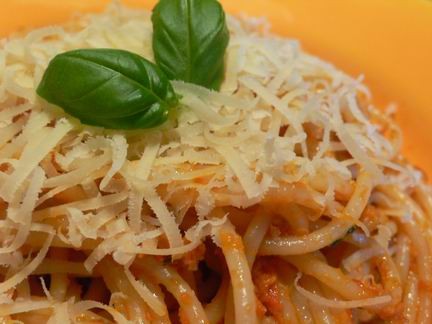 а сейчас еще одну тарелку покажу - Спагетти с розовым песто - несравненно вкуснее готового из магазина!: