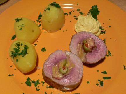 Поскольку голандского соуса в этот раз у меня осталось довольно много, то сделала к нему Фаршированное свиное филе: