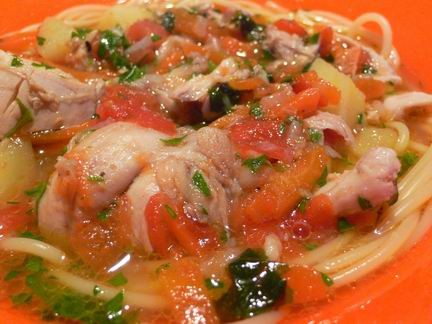 ![]() На 8 порций: Полкило говядины, порезать как на бефстроган 2 луковицы, порубить зубчик чеснока (можно больше) остренький перчик, мелко порезать 2 морковки, порезать соломкой паприка(у меня была желтая), порезать соломкой. одна небольшая редька, порезать кубиками (не была уверена как выглядит местная редька, купила нечто, длинный такой корень типа как у петрушки 2 картофелины, порезать кубиками пару-тройку помидоров (у меня был адЫн но огромный! С полкило весил, мясистый такой сорт зелень(у меня была только петрушка) На лапшу: 150г муки, яйцо, немного воды, соль Я не очень люблю лук в супе и потому в данный раз сделала ход конем: припустила на небольшом огне в масле лук, чеснок и острый перчик и томила минут 10-15 постоянно помешивая пока лук почти не разваливался(типо как лук для лукового супа томят). Выложила из кастрюли, обжарила в ней мясо, когда оно пустило сок – вернула лук в кастрюлю, потушиила, добавила морковку, полушила и залила водой чтобы мясо было покрыто. Варить час до готовности мяса. Добавить картошку, паприку и редьку, когда картофель будет готов – добавить томат (как и в предыдущем рецепте томат вообще-то ложится в начале, но мне так нравится Вообще-то к лагману положена лапша, которую можно тянуть самому, на такие подвиги меня вчера не тянуло (но собираюсь обязательно как-нибудь попробовать!), плюс вычитала что широкая лапша тоже пойдет, потому взялась за лапшу Пока готовилось мясо, замесила из муки, яйца и воды крутое тесто, дала ему час постоять. Раскатала и порезала на лапшу при помощи машинки для изготовления макарон – очень удобная весч в хозяйстве и времени занимает 10 минут Отварила лапшу, разложила по тарелкам, сверху полила подливой. Примечания: в середине процесса было у меня подозрение что редька варится дольше картофеля но в конце оно развеялось Домашняя лапша – это весч! Придает блюду домашнюю нотку, а поскольку у меня яйцо было огромное и воды в тесто добавляла буквально пару ложек – получилась яичная лапша, мне понравилось! Она упругенькая и не разваливается Правда остается открытым вопрос – а как это блюдо кушать? Я подаю ложку с вилкой, лапшу накручиваешь на вилку, остальное ешь ложкой. Так и надо? |