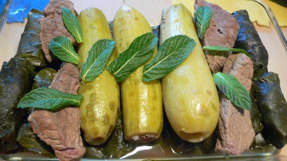 Опять готовила я долму, но теперь как Вика велела, с фаршированными кабачками: сперва отварила мясо, положила на дно кастрюли, сверху фаршированные кабачки(впринципе потому и взялась за это блюдо потому как наконец-то маленькие кабачки нашла!правда они тоже немного больше чем надо…), начинка как у долмы – мясная, и сверху долма, залила бульоном, который получился от варения мяса, и минут 40 тушила.