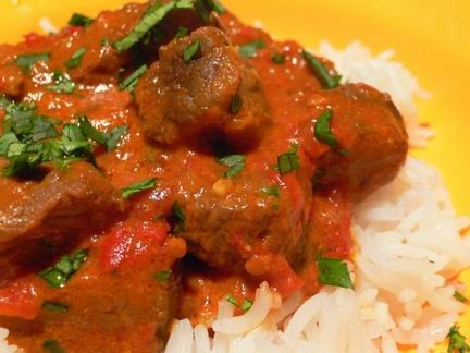 Блюдо из индийской кухни, очень вкусное ипростое в приготовлении! ![]() На полкило говядины: 1чл топленного масла (или просто сливочного, в индийской кухне используется топленное) 1 луковица 1 зубчик ченока 1 зеленый чили ½ ст.л тертого имбиря 1чл гара массалы ½ чл кумина ½ чл кориандра порошек острой паприки по вкусу половина 410-грамовой банки помидоров в собственном соку 125 мл кокосового молока. Лук порубить, припустить в масле до прозрачности, добавить чеснок, мелко порезанный чили, остальные приправы, перемешать, немного потушить. Добавить порезанное кубиками мясо и быстро обжарить со всех сторон на большом огне, уменьшить температуру, добавить порезанные кубиками томаты(я добавляла вместе с соком) и тушить на маленьком огне час-полтора. В конце добавить кокосовое молоко, потушить 5 минут с открытой крышкой пока соус не загустеет. Подавать с рисом, посыпав рубленной кинзой. |