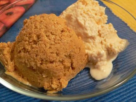 ![]() 2 яйца 2 желтка 250мл сливок 100-150г сахара соль для Кокосового мороженного: 400мл кокосового концентрированного молока 3-5ст. л. кокосовой стружки 1пакетик ванильного сахара (вообще-то в оригинале должен быть кокосовый крем, а не молоко и стружка, крем не нашла, а молоко нашла концентрированное, или же в отстоявшемся молоке гуща плавает сверху – вот ее взять а немного жидкости полупрозрачной слить, думаю будет то же самое) для Манго-мороженного 400г мякоти манго Желтки, яйца, сахар и соль взбить миксером в течении двух-трех минут, поставить на водяную баню и продолжать взбивать, постепенно добавляя сливки. Взбивать хороших 10 минут. Консинстенция будет довольно жидковатая, как у жидкого крема. Для кокосового мороженного кокосовое молоко также постепенно добавить, пока яичная смесь находится на водяной бане. Снять с огня, перелить в холодную посуду, добавить кокосовые стружки и ванильный сахар для кокосового мороженого и спюрированную мякоть манго для мангового. Дать полностью остыть, периодически помешивая. Перелить в широкую неглубокую форму и поставить в морозилку. Когда масса полузастынет – примерно часа через полтора-два – еще раз быстро взбить ее миксером. Вернуть назад в морозилку и дать полностью застыть. Перед подачей на стол дать постоять минут 10 при комнатной температуре, чтобы мороженное было мягче. Мои примечания: Моя морозилка была не в очень большом восторге от требования охлаждать столько мороженого и морозила как-то очень медленно, я каждые два часа заглядывала и перемешивала его энергично ложкой. За 6 часов в холодильнике до прихода гостей оно заморозилось до кремистого состояния и оттаивать мне его не пришлось – было просто супер правильная консинстенция! Остатки потом замерзли и их на самом деле следует подтаять перед подачей Я делала с соевыми сливками, потому как один друг алергик не молоко, и вот какое замечание: манго с соевыми сливками не дружит Самый простой рецепт манго-мороженного: взбить стакан сливок с сахаром, добавить 400г спюрированной мякоти манго, хорошенько перемешать и поставить в морозилку. Часа через полтора-два когда масса полузастынет еще раз взбить миксером и поставить назад в морозилку. Перед подачей дать постоять минут 10-15 при комнатной температуре. |