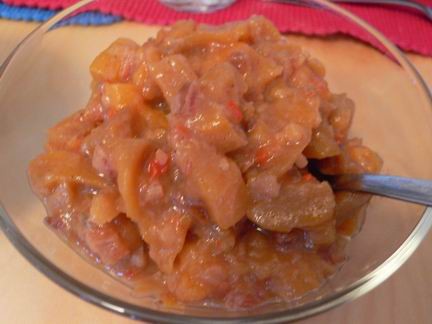 ![]() 3 больших манго 2 перчика чили 1/2чл гарам масалы 1 сл тертого имбиря 300г сахара 250мл белого винного уксуса 100г фиников Манго почистить и порезать небольшими кусочками. Уксус с сахаром и гарам масалой смешать и покипятить минут 5, добавить анго, мелко рубленный чили, имбирь и мелкорубленные финики и тушить около часа, пока консинстенция не будет как у варенья. Разложить по стерелизованным банкам, хранить в холодильнике. |