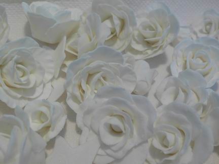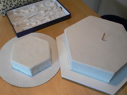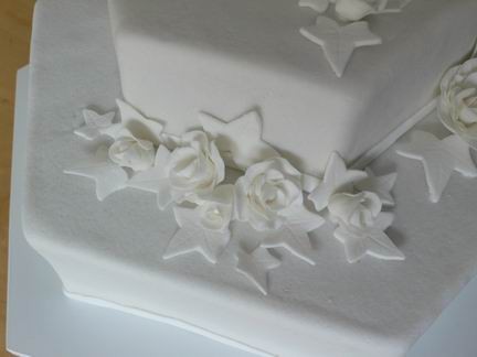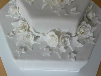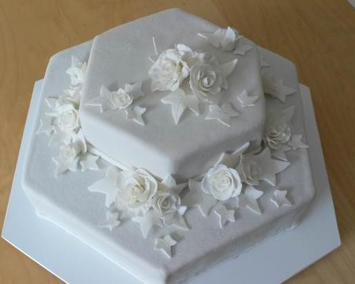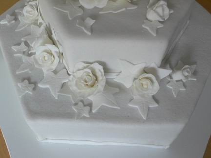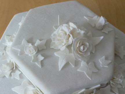 Немного белковой глазури нанести на подставку для торта и прикрепить на нее нижний ярус. Вставить в середину «дюбель для торта», который будет держать верхний ярус (я его сделала сама – купила круглую деревянную палочку в магазине для рукоделия диаметром с карандаш, отпилила нужной мне длинны и заточила в точилке для карандашей) ![]() Поместить верхний ярус на нихний, нанизав его на дюбель Тоненько раскатать мастику и вырезать ленту 5мм шириной, приклеить ее водкой(тоненько нанести водку кисточкой на нижний край мастики) по низу ярусов. ![]() Теперь берем элементы для декорации, которые можно(и даже нужно!) приготовить заранее, в моем случае это белые розы из мастики: ![]() И листочки плюща, которые я вырезала специальной формочкой и положила для высыхания на ксладками сложенную кухонную бумагу чтобы придать листьям легкий изгиб. ![]() Теперь осталось декоративно разложить розы и листья на торте, «приклеивая» их белковой глазурью. Дать глазури высохнуть. |