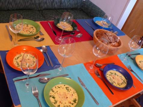 Мы праздновали мой день варенья, который был почти две недели назад, когда мы были во Франции, смотрели слайды о нашем отпуске, да и все еще под впечатлением – лето, Франция, яркие краски – хотелось чего-нибудь такого! Легкого, летнего, яркого Первым блюдом был Золотистый Гаспаччо от Нелли (впринципе большинство блюд я готовила по ее рецептам), который мне так полюбился в последнее время, и все гости без исключения его очень хвалили!!! так выглядет стол: ![]() а эту чуть поближе: ![]() (правда сегодня за мытьем посуды я вспомнила что совершенно забыла положить в него помидорки и виноград, но было и так очень вкусно, да и никто и не заметил что чего-то не хватает, плюс как первое блюдо для длинного ужина в жаркий день легкий гаспаччо – то что надо!) Вторым блюдом были Фаршированные абрикосы с рукола-салатом в соусе из лесных ягод, украшенные цветком настурции ![]() Настурцию я выращиваю на подоконнике, это растение замечательно не только тем, что отпугивает тлю(раньше у меня с нею были периодически проблемы), но и ее листья и цветы можно кушать в салате. Цветы обладают довольно интенсивным, чуть горьковатым, ореховым вкусом и просто шикарно смотрыяться на тарелке! Ко всему этому мы поедали хлебушек Тортано, опять же от Нелли: ![]() А так он выглядет сразу после духовки ![]() Этот хлеб уже многие рекламировали, но и я не могу не воспеть ему хвалу!!!! Кто его еще не пробовал – бегом на кухню это исправлять! Читая рецепт смущает фраза – «на его приготовление уходит 12 часов», но на самом деле работы с ним совсем немного! А результат! Меня выпытывали, какой мукой я пользовалась и что я такого делала, потому что хлебушек на простой пшеничный не очень похож, обалденная корочка, нежная, ароматная мякоть – сказочно вкусный хлеб! Буду печь еще – однозначно! |