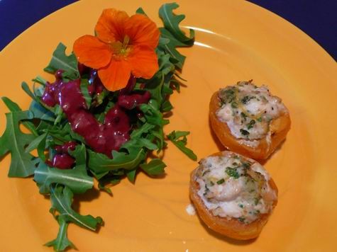 Фаршированные абрикосы с рукола-салатом в соусе из лесных ягод, украшенные цветком настурции