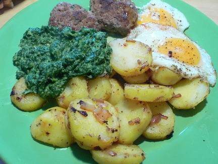 Вот такое типично немецкое блюдо, к тому же одно из любимых у моего мужа Жареная картошка с котлетами, шпинатом и яичницей ![]() Котлеты Я добавляю в фарш(пополам говядина и свинина) только яйцо, луковицу и зелень петрушки, получаются очень мясные котлетки Жареная картошка по-немецки У немцев несколько иное представление о жареной картошке, делюсь с вами! Сперва катрошка отваривается в мундире, лучше брать картофель не рассыпчатый, иначе потом при жарке он развалится в кашу. Горячим почистить и порезать кружочками. Мелко порезать одну луковицу. Потом кладем лук и картофель на сковородку и обжариваем все вместе на довольно большом огне, постоянно помешивая. Я обжариваю картофель в жиру, стекшем с котлет. Еще можно к картофелю в сковородку порезанный кубиками бекон добавить, но если картофель с котлетами кушать - то бекон не нужен. Шпинат со сливками - Rahmspinat Можно купить готовый, замороженный, разморозить и довести до рипения, а можно сделать самому. Я покупаю замороженный молодой шпинат, уже порубленный. Положить в кастрюльку, разморозить, поставить на огонь. На полкило шпината влить полстаканчика сливок. Посолить, добавить молотый муксат. Можно положить чеснок, если кто не хочет сильного чесночного привкуса - можно положить зубчик, разрезанный пополам, буквально для запаха. |