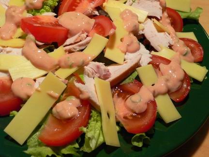 Салат с курицей ![]() Выложила на тарелку зеленый салат(порванный на небольшие части, я его всегда рву руками), раскидала в художественном порядке помидорки, куриное мясо, сыр, поридорки: ![]() Теперь делаем соус. Я не любитель майонеза, а этот соус сделала по мотивам соуса "1000 островов", что как-то давала Нелли(точного рецепта не помнила а в нете искать было лень Полстаканчика натурального йогурта лучек, мелкопорезанный - 1сл мелко порезанный маринованный огурчик - 1сл кетчуп - 1-2 сл соль, перец (я не солила, огурчик был соленый и кетчуп тоже...) все смешать и полить салат |