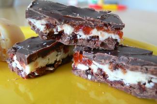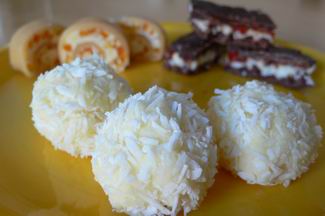 это Рафаеллики с большим количеством белого шоколада ![]() За основу начинки я взяла мой любимый рецепт трюфелей, в данном случае из белого шоколада: На 300г шоколада (в данном случае белого): 100мл сливок 60мл кокосового ликера (у меня не было, я смешала кокосовый сироп с белым ромом – получилось по сути то же самое) 50г кокосового жира (такой белый, без вкуса и запаха) 50г масла На водяной бане растопить шоколад. В маленькой кастрюльке нагреть сливки с ликером, но не кипятить. Снять с огня и добавить масло и кокосовый жир, помешивая до полного растопления. Остудить до теплого состояния и влить шоколад, энергично помешивая до полного соединения обоих масс(сперва будет казаться что массы не очень хотят смешиваться – это нормально, продолжать энергично помешивать). Выложить форму пленкой, вылить в нее массу, накрыть пленкой и поставить застывать на сутки(я в холодильник не ставлю, а просто в холодное место, например на подоконнике). Масу выложить на доску, снять пленку, порезать на одинаково большеи кусочки (прямоугольники или квадраты). Холодными руками быстренько сформировать шарики, запихивая в серединку миндальный орешек (орешки сперва залить кипятком на пару минут, снять шелуху, и обжарить на сухой сковородке). На этом этапе я обваляла конфеты в кокосовой стружке, а по идее можно было бы еще покрыть их белым шоколадом и тогда обвалять в кокосе, так они могли бы храниттся пару недель, в плотнозакрытой посуде в прохладном месте. Абрикосовые улитки ![]() 100г сушеных абрикосов (или других сухофруктов) 2ст.л абрикосового ликера 75г белого шоколада 200г марципана Абрикосы мелко порубить и залить ликером, дать настоятся с полчаса. Марципан раскатать в прямоугольник(я делала порционно, раскатывала положив марципан между пленкой, очень удобно, ни к чему не липнет). Растопить шоколад, добавить абрикосы, перемешать, выложит на марципан и зразравнять. (поскольку белый шоколад капризный к другим компонентам и грозит свернуться , я сделала по другому – выложила сперва абрикосы, потом залила шоколадом и разровняла). Дать шоколаду немного застыть и скрутить рулетик (иначе шоколад будет течь под руками). Поставить на холод на час, потом порезать на кусочки Слоеные конфеты ![]() По 100г белого, молочного и горького шоколада 150г кандированных фруктов (в оригинале – сушеные засахаренные папайя и манго, у меня были кандированные вишни) 2ст.л.рома(я к вишням взяла амаретто) Фрукты мелко порубить, залить ромом, дать настоятся полчаса. Выложить прямоугольную форму пленкой, вылить в нее сперва растопленный молочный шоколад. Постучать по дну формы чтобы шоколадная поверхность стала ровной. Выложить половину аккуратно половину фруктов. Аккуратно ложечкой выложить растопленный белый шоколад, вторую половину фруктов и последним слоем горький шоколад. Дать застыть. В оригинале советовалось поставить в холодильник на час и разрезать на кусочки, но я побоялась что шоколад побелеет и оставила застывать в комнате, потом пославила на полчас недалеко от батареи, чтобы шоколад при резке не крошился, и порезала на кусочки. |