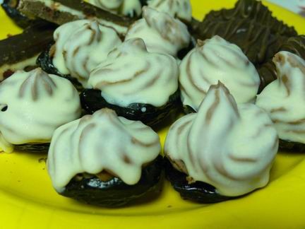 вот еще конфетки Чернослив с начинкой из нуги ![]() На одну шоколадку с нугой(100г) (в оригинале смесь нуги с шоколадом) 10г кокосового жира (такой белый в твердом виде, без цвета и запаха) 30мл сливок 30% жирности пару ложек сливовой водки (я делала без нее) чернослив фундук белый шоколад для покрытия, ок.100г, возможно меньше шоколадку растопить, добавить растопленный в сливках кокосовый жир, хорошенько перемешать и оставить на ночь на холоде застывать. Взбить миксером с добавдением сливовой водки. Чернослив сформировать руками в виде лодочки, положить в каждый по орешку-фундук(предварительно обжарив на сухой сковородке и обтерев руками шелуху). Поместить взбитую нугу-массу в кулек и выдавить с насадкой-звездочкой вокрукг орешка. Дать застыть на холоде. Растопить белый шоколад на водяной бане, окунуть в нем конфеты(часть с нугой, до чернослива) и поставить застывать. Можно просто ложечкой белый шоколад наносить и стружкой шоколадной посыпать, но мне понравиось как нуга из под шоколада просвечвается |