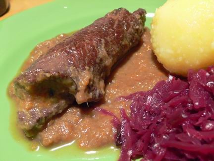 ![]() Мясо для рулетиков у нас продается именно под таким названием – дли рулетиков, здоровые такие тоненькие ломти, вырезанные из бедра. Поскольку они хороших сантиметров 40 в длинну – я их разрезаю пополаи и делаю маленькие рулетики, ну или точнее относительно маленькие. Мясо сперва просушить полотенцем и слегка отбить кулаками (или как часто показывают по телевизору – тяжелой сковородкой, но ни в коем случае не молотком для отбивки мяса!). Каждый кусочек смазываем сперва горчицей, затем ложим тоненький кусочек (или несколко, по размеру мяса) жирной подкопченной ветчины (типа бекона), на нее выкладываем мелкопорезанные лук(щедро) и каперсы(не сильно много, как вариант вместо каперсов – тонко порезанный маринованный огурчик, я делала и так, и так, оба варианта вкусны!). Скрутить мясо рулетиком и закрепить зубочисткой или связать нитью. Обжарить со всех сторон в очень горячем масле, сложить в моем случае в римский горшок(замоченный заранее в воде с часик), положить порезанные кубиками морковку, кусочек сельдерея и небольшой порей, залить полстаканом красного сухого вина и полстаканом бульена. (впринципе овощи можно и пропустить, но мы любим соус попряней) Ставим на час в духодку (не разогретую если делаем в римском горшке!) на 180градусов, потом снижаем до 160 и еще часик-полтора. Выложить рулетики, соус спюрировать блендером, можно добавить по вкусу сметаны. Если нет римского горшка – то ложить овощи и жидкость в сковородку где жарилось мясо и тушить на маленьком огне под крышкой часа полтора. |