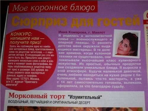 Роллы бесподобные Я девы сегодня соорудила пудинг от Иришки Кутовой. Воть, ща спасибу пойду заспасиблю. ![]() А это девульки прикупила сегодня журнальчик кулинарный Лизку и что вы думаете на развороте вижу подозрительно знакомую моську это- наша ИННЕСКА! Вот гляньте. ![]() |