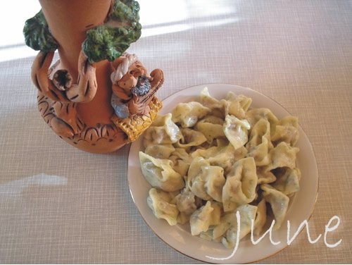 ![]() Тесто: 2 стакана муки, 1 яйцо, ½ стакана воды, ½ чайн. ложки соли, ½ пучка укропа. Начинка: 350-400г мясного фарша, 100г репчатого лука, соль и перец по вкусу. ![]() 1. Просеять в миску муку. В другую миску налить воду, добавить яйцо, соль и хорошо размешать. Укроп мелко нарезать. Смешать муку, укроп и жидкую смесь. Замесить тесто и оставить его на столе под чашкой на 20-30 мин. 2.Раскатать тесто длинной скалкой. 3. Середина теста получается тоньше, чем края. Поэтому с помощью другой скалки(с двумя ручками по бокам), раскатываем края. 4. У меня получился круг из теста диаметром 80 см. ![]() 5. Намотать тесто на скалку и размотать его гармошкой на стол. Нарезать гармошку на отрезки длиной 5 см. 6. Получилось несколько полосок шириной 5 см. Сложить одну полоску на другую, не забывая присыпать между ними мукой. 7. Нарезать многослойную полосу на отрезки длиной тоже 5 см. 8. У меня получилось около 160 квадратиков со стороной 5см. ![]() 9.На середину квадратика положить 1/2 чайн. ложки начинки. 10. Сложить квадратик пополам относительно одной из сторон(не по диагонали). 11. Сгиб прямоугольника-это внешняя сторона. Взять чучвару в левую руку сгибом к себе между большим и указательным пальцем. Левый верхний угол загнуть на ноготь большого пальца. Правый верхний угол перевернуть и прикрепить к левому углу.(Этот способ залепки взяла из книги «Полезные советы» , пошаговое фото из книги ) 12. Вот что получилось. Чтобы квадратики из теста не заветривалось, пока лепите пельмешки, можно их накрыть пленкой или тканью. Вскипятить круто посоленную воду, опустить в неё чучвару, когда она вплывёт, дать закипеть и варить 2-3 мин. Выложить пельмени на блюдо, посыпать пережаренным до золотистого цвета на топленом (растительном) масле луком, подать к столу. Мы любим по-русски, со сметанкой. Укроп в тесто добавила для разнообразия и красоты. Если вы будете в Узбекистане, то вам подадут жареную чучвару. Такие пельмешки просто жарят во фритюре. Или чучвару-шурпу. Это варят бульон, добавляют протертые томаты, лук колечками и пельмешки. Подают с кислым молоком и зеленью. Дополнительный источник: Тонко тесто меня научила раскатывать соседка Наргиза, я теперь такое тесто готовлю для ханум и мант. |