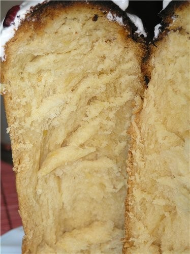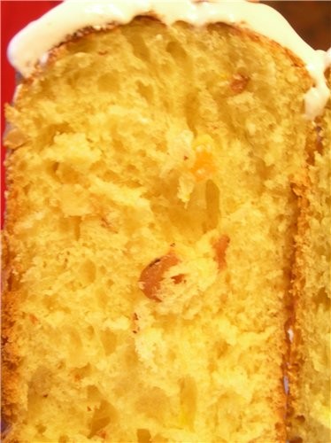 Это общий вид. Я всегда украшаю куличи только натурпродуктом - орехами, сухофруктами, т.к. красивые цветные присыпочки у нас в семье не едят, а счищают и просят меня не жертвовать вкусом ради красоты. ![]() А это разрезы. Это тот самый - настоящий бабушкин волокнистый (из добавок только изюм, много лимонной цедры и ваниль) ![]() А это шафрановый - с шафраном, кардамоном, изюмом, миндалем и цукатами. |