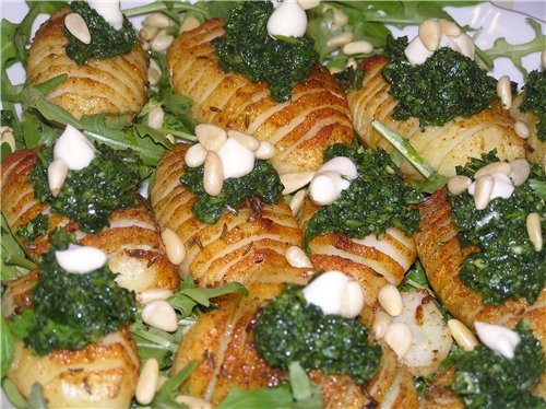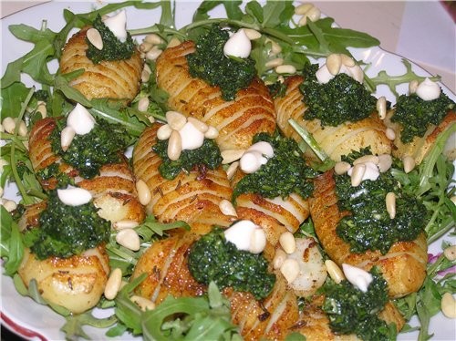 Лен, я тебе в личку по поводу фоток написала. Так, а мы продолжаем радоваться наступившей весне и тому разнообразию зелени, которое уже появилось на наших рынках. Истосковавшийся за зиму по траве организм радуется сейчас любой свежей травке и в сегодняшнем блюде я постаралась использовать побольше зелени, которой я от жадности накупила очень много. Это правда не относится только к рукколе, которую я в любое время года, днем и ночью готова поглощать в огромных количествах, напоминая самой себе кого-то из травоядных. Печеная картошка с пряной зеленью ![]() 12-15 небольших картофелин, 50 г слив.масла, паприка, молотый мускатный орех, тмин, пучок рукколы, по 0,5 пучка петрушки, базилика, эстрагона и орегано, 1 зубчик чеснока, 2-3 ст.л. оливкового масла (первого отжима), кедровые орешки, 100 г рукколы Духовку нагреть до 200 град. Картошку помыть, очистить и надрезать часто поперек, не дорезая до конца. Выложить картошку в форму для запекания, посолить и посыпать мускатным орехом, паприкой и тмином. Затем на каждую картошку положить по небольшому ломтику слив. масла, поставить в духовку на 50-60 мин. Петрушку, эстрагон, базилик и орегано измельчить с солью, чесноком и оливковым маслом в блендере до пастообразного состояния. На блюде разложить рукколу и сбрызнуть оливковым маслом, выложить на нее картошку. На каждую картофелину выложить пасту из зелени и посыпать все кедровыми орешками. ![]() Это очень вкусно! |