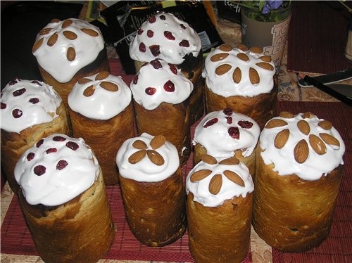 Вот и мои куличики. Рецепты пока не выкладываю, т.к. на форуме уже полно разных куличей и я не знаю нужны ли тут еще и мои до кучи. Но, если нужны, вы только свистните и я мигом исправлюсь!