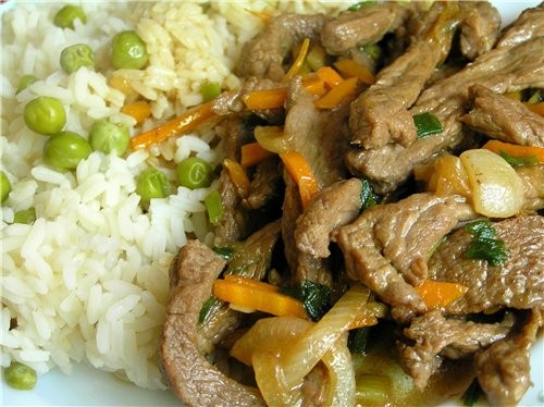 Для меня основная прелесть мясных азиатских блюд в скорости их приготовления. Главное заранее мелко порезать и правильно замариновать мясо, а потом все занимает буквально 10 мин, причем вкус от этого ничуть не страдает, а наоборот. Мясо нужно жарить быстро, на максимальном огне, желательно в воке или в глубокой сковороде, гле его можно быстро мешать, чтобы оно не тушилось, а жарилось. Важно еще изначально выбрать правильное мягкое мясо, которое не требует тушения, для говядины это особенно актуально. Ну и восхитительных смеси ароматов имбиря, соевого соуса и чеснока от этих блюд тоже никто не отменял. На гарнир очень хорошо подходит рис, который я сегодня сварила с горошком.