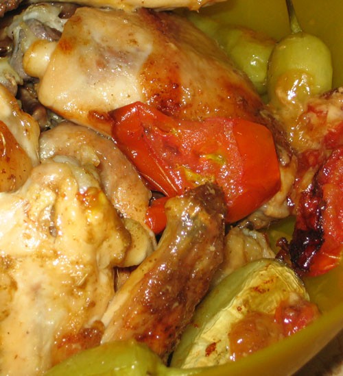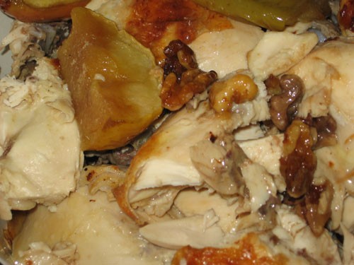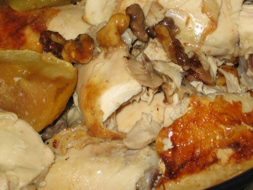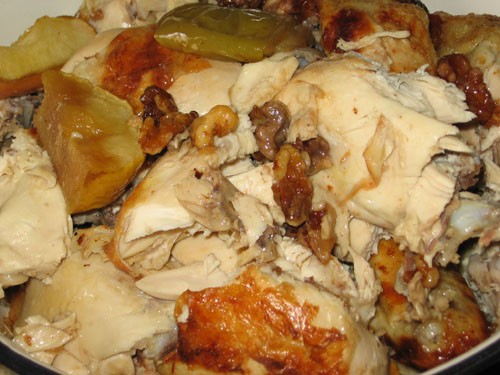 Курица Яблоки - 4 Грецкие орехи - 200 гр Майонез, мед, соль, перец, паприка, камун (зира) Примерно 2 стол.ложки майонеза смешать с чайной ложкой меда и специями, обмазать курицу снаружи и внутри. Яблоки порезать на четверти. Несколько яблок засунуть в курицу вместе с горстью орехов, остальные яблоки и орехи выложить на лист рядом с курицей. Поставить курицу в духовку на 230 гр, через 15 минут снизить температуру до 210 гр. Через пол часа перевернуть курицу на другую сторону и запекать еще 30-40 минут (можно снизить огонь до 200 гр, если курица будет слишком загорелой). ![]() ![]() ![]() |