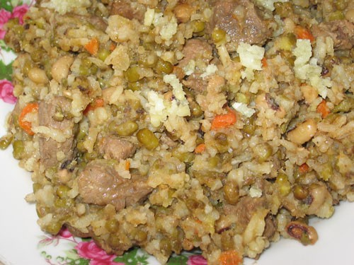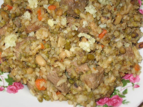 (Рецепт от Iden с Фромуза, словами автора) Этот семейный рецепт я переняла, как эстафетную палочку, от моей свекрови, которая, в свою очередь, научилась делать это блюдо у своей свекрови. Интересно, захочет ли моя будущая невестка готовить машкичири? Навряд ли. А жаль.... Эту фасоль я специально привезла с собой из Ташкента. Здесь такая не водится. Сорт фасольки называется «Черный глаз». Продукты: Маш 400 г Рис 300 г Белая фасоль 80 г Мясо, лучше мякоть (говядина или баранина) 500 г Лук 330 г Морковь 350 г Раст. масло 250-300г Соль 1ст.л. c горкой Красный перец Зра Вода примерно 1,8 л Чеснок 2-3 зубчика Приготовление: Маш и фасоль перебрать, замочить в холодной воде на ночь. Воду слить и еще раз перебрать, удаляя темные, мелкие, неразбухшие бобы. Мясо и чищеную морковь нарезать мелкими кубиками. Лук – тонкими полукольцами. В отдельную огнеупорную мисочку надавить чеснок. Нагреть в котле масло. Зачерпнуть половину половника раскаленного, но не дымящегося масла, и залить им чеснок в мисочке. Отложить в сторону. Это будет наша чесночная заливка к уже готовой потом каше. В оставшееся масло выложить лук и жарить до слабо-золотистого цвета. Затем добавить мясо. Жарить до образования румяной корочки. Следующей добавить и жарить морковку. Залить продукты горячей водой, добавить разбухший маш и фасоль, довести до кипения и убавить огонь до среднего. Посолить, поперчить, положить зру. Варить их до тех пор, пока не треснет оболочка на бобах. Добавить в котел, промытый несколько раз рис. Снять пробу бульона на соль. При нехватке ее – досолить. Постоянно помешивая, варить кашу до полного испарения воды, готовности риса, маша и фасоли. Обернуть крышку котла кухонным полотнянным полотенцем. Закрыть котел и оставить на самом тихом огне еще минут на 15-20. Снять крышку. Выложить кашу на блюдо, сверху равномерно залить чесночной заливкой. Приятного аппетита! Я давно собиралась сделать это блюдо, так как суп делаю очень часто, хотелось сравнить. Просмотрев несколько рецептов, очень похожих между собой, остановилась на этом, потому что как раз такую фасоль приобрела на прошлой неделе в магазине и очень хотелось ее куда-то пристроить. Лично мне блюдо очень понравилось. Единственное - настроение подпортила пищевая моль нагло забравшаяся в круглый рис, поэтому пришлось использовать персидский длинный и в меньшем количестве. Источник: http://www.fromuz.com/forum/index.php?showtopic=11498&st=30 ![]() |