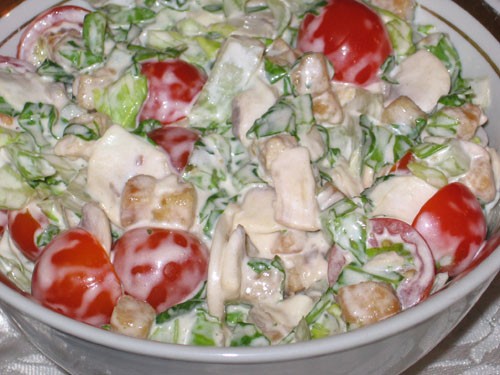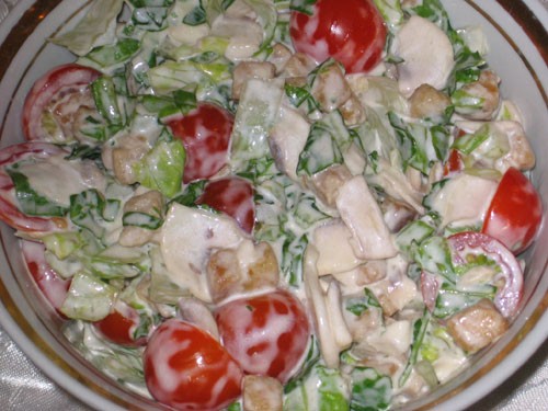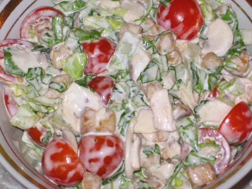 Салат "Лагуна" ![]() помидоры черри - 15-20 (маленькие, а не средние) хаса (салат) - пол пучка шампиньоны - 4 больших крутоны - у нас продаются такие очень жесткие, мелкие сухарики, которые добавляются в суп, примерно 100 - 150 гр майонез, томатная паста Хасу порезать, помидорки разделить на две части, свежие шампиньоны тонко нарезать. Все перемешать, добавить крутоны (сухарики). В майонез добавить примерно чайную ложку томат.пасты, перемешать. Заправить салат, если нужно посолить по вкусу. Быстро, легко, вкусно ![]() |