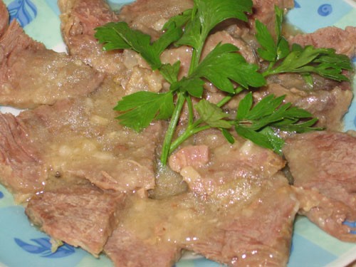 Жаркое из телятины телятина - 180 гр жир - 15 гр чеснок - 5 гр мука - 5 гр лук - 10 гр соль Кусок мяса натирают растертым с солью чесноком, посыпают мукой, обжаривают в сильно разогретом жире до образования румяной корочки и кладут в кастрюлю. Вливают воду, прибавляют жир от жаренья, нарезаннный кружочками лук и тушат под крышкой на слабом огне. По мере выпаривания соуса добавляют воду. Когда мясо станет мягким, всыпают муку и проваривают жаркое на слабом огне. Подают мясо на блюде, нарезав под углом к волокнам широкими ломтями, залив соусом и украсив зеленью. Отдельно подают гарнир - картофель, отварные овощи, салат из сырых овощей. ![]() ![]() Источник: "Самые популярные блюда мира", Ж.Е. Райченок |