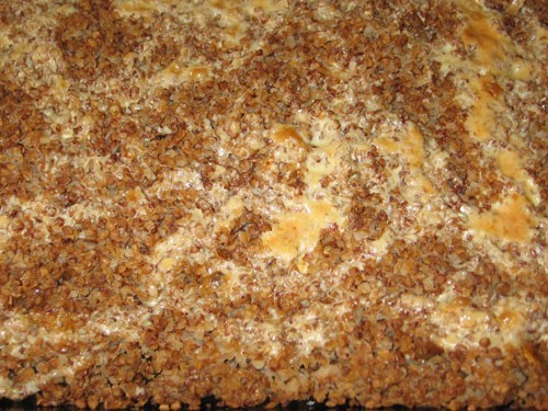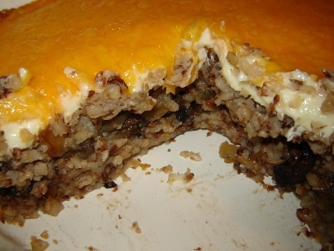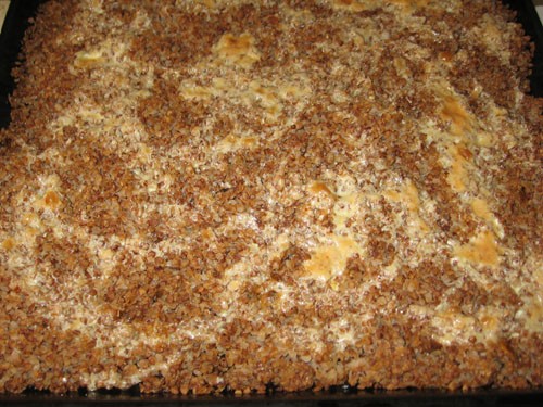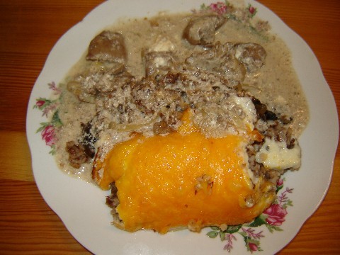 Каша гречневая, запеченная с грибами ![]() Гречка - 70 гр Масло сливочное - 15 гр (я брала маргарин) шампиньоны свежие - 70 гр лук - 10 гр сыр - 10 гр жир для смазки - 5 гр сметана - 125 гр яйцо - 1 шт соль Готовят рассыпчатую гречневую кашу (прежде чем засыпать крупу, в воду добавляют половину предусмотренного рецептом слив.масла). Грибы очищают, промывают, нарезают тонкими ломтиками, добавляют нарезанный кольцами лук, масло, немного воды, соль перец и тушат до готовности. Половину готовой каши выкладывают на смазанный жиром противень, на нее кладут слой тушеных грибов и накрывают оставшейся кашей. Заливают взбитой с яйцом подсоленной сметаной, посыпают тертым сыром и запекают в жарочном шкафу, пока сыр не зарумянится. Подают с салатом из сырых овощей. (Так как гарнир подавался к мясу вместо сметаны я использовала майонез, а сыр не положила совсем). ![]() |