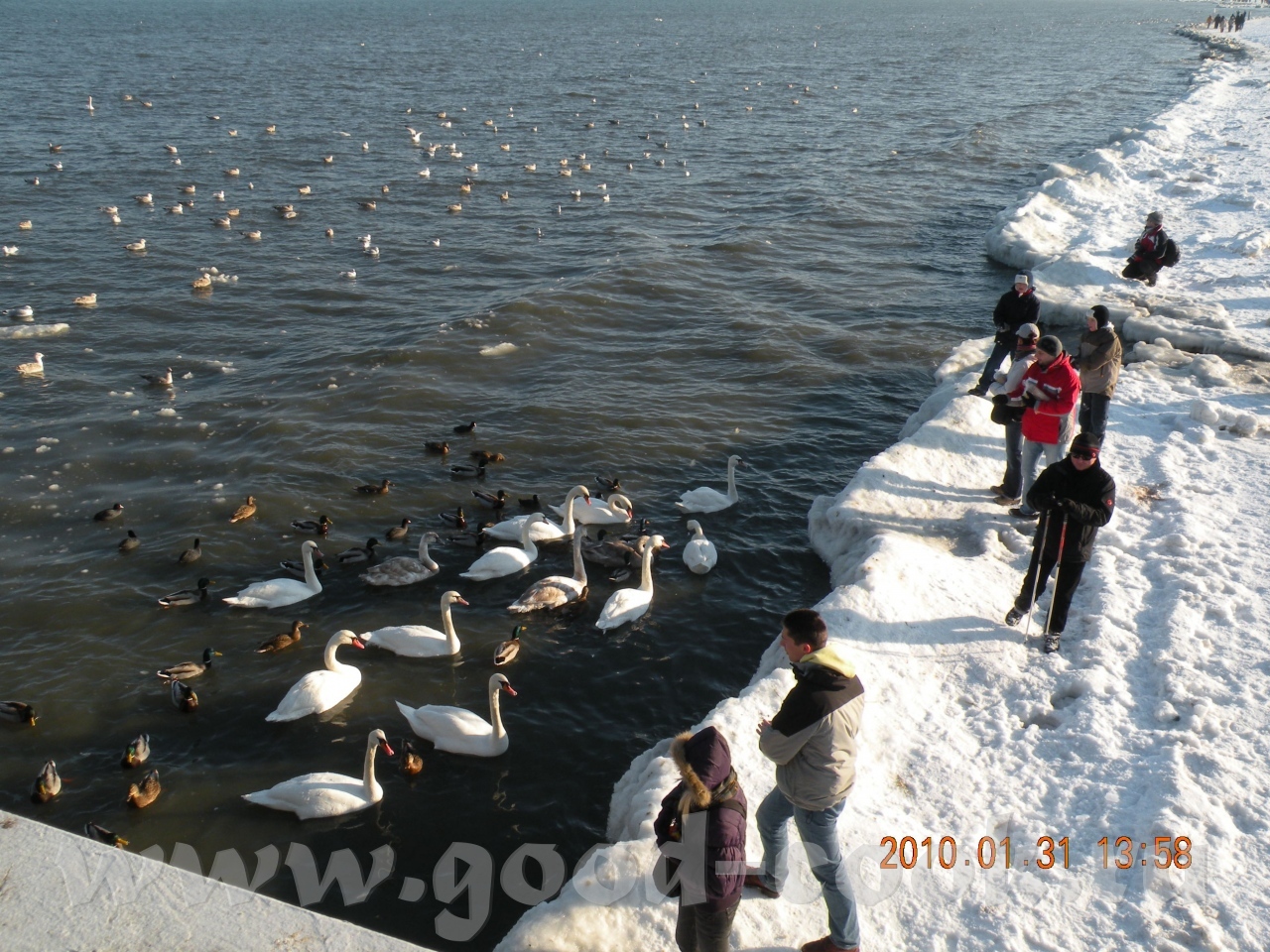 Танюша, замечательная поездка! Спасибо за фотки. Так странно смотреть на сочетание снежного берега с синим морем. И лебеди... Очень красиво. |