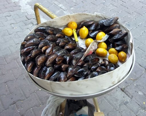 А мне очень понравились вот эти мидии в Стамбуле, продают прямо на улице, продавец сам открывает, п...