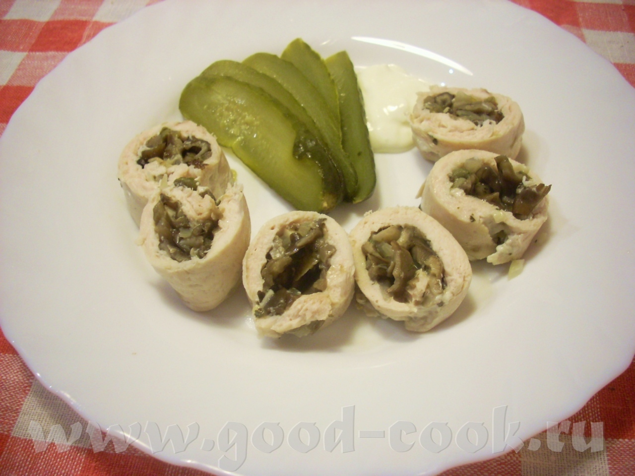 от меня- многовато я взяла грибов, но начинку использовала всю, потому рулеты у меня тонко не резались.