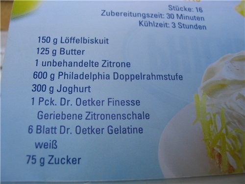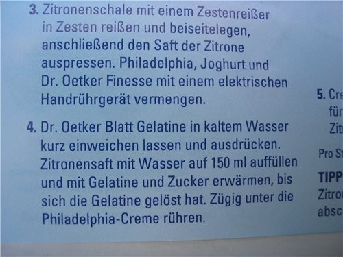 Sokolova чё то я не пойму чаво народ хочет- превод текста или узнать что за рецепт. это лимонный торт без выпечки по подобию Тирамизу. рассчитано на то, чтобы покупали сразу 3-4 пачки филадельфии. у нас она стоит 1,5 раза дороже обыкновенного точно такого же сыра. не заморачивайте себе голову, т.к. все эти рецепты обычно дорогие и рассчитаны на то что побегут покупать желатин и сухой порошок лимонной цедры по бешенной цене именно от этой фирмы на рецепте.