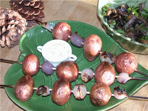 КАРТОФЕЛьНЫЕ ШАШЛУЧКИ с ГОРЧИЧНЫМ МАЙОНЕЗОМ 2.25 фунта молодой картошки 7 унций шалота (разрезанного на половинки) 2 ст ложки оливкового масла 1 ст ложка морской соли Картошку помыть, но не чистить и проварить 5 минут в кипятке. Откинуть на дуршлаг. На деревянные палочки насаживать попеременно картошку и лук. Смазать маслом посыпать солью и запекать. Или на гриле или под заранее нагретой верхней спиралью (минут 15-20) раза 2 перевернув. ![]() К картошке были Нелли-Зоиины грибы от Питера. Очень рекомендую! |