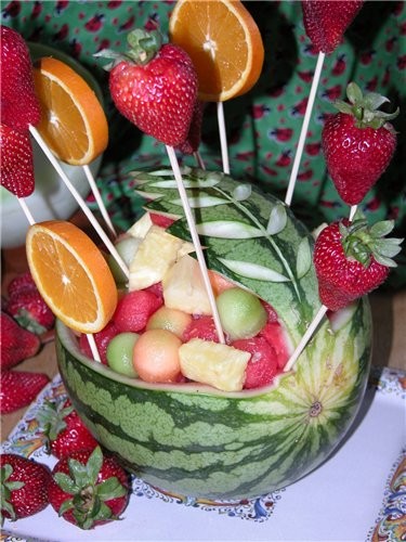 Лерочка, тогда вот тебе "секрет". Поскольку "лист" над корзинкой "висит", то есть он соеденён с арбузом только с одной стороны, то тебе надо взять ещё одну шпажку и насажать не неё фруктов. Воткнуть её в дно арбуза и она-то и будет подпоркой для "листа". А поскольку на ней фрукты, то дизайна она портить не будет. Кстати, конечно можно фруктами заполнить шпажки полностью, но на мой взгляд всё тогда выглядит очень тяжеловесно. Но разнообразить можно, например, цветочными выемками для печенья вырезать из фруктов цветы и насажать на шпажки их. |