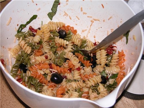 есть несколько вещей (в кулинарной области) которые вызвали у меня неприятие по началу: пюре из нечищенной картошки, стеблевой сельдерей с ореховым маслом, сырые овощи, которые следует макать в соус вместо салата и салат из макарон. Етот резепт я впервые попробовала лет етак 8 назад, да так на нём и застряла. Поетому, если идея макарон комнатной температуры для вас всё ещё остаётся чуждой, можно рискнуть и начать с етого салата. Я использовала цветные макароны, но можно взять обычные спиральки. Прошу прощения за "непосртоенное" фото - времени не было...