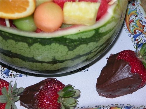 Кстати, конечно можно фруктами заполнить шпажки полностью, но на мой взгляд всё тогда выглядит очень тяжеловесно. Но разнообразить можно, например, цветочными выемками для печенья вырезать из фруктов цветы и насажать на шпажки их.