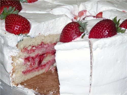 Ванильный "поунд" торт 3 чашки обычной муки 1.3 ч л пекарского порошка 0.5 ч л соли 8 унций несолёного масла комнатной температуры 2 ч сахара 3 больших яйца комнатной температуры 1 ч молока комнатной температуры 2 ч л ванильного екстракта 2 ч л миндального екстракта Нaгреть духовку до 350Ф. Смазать две 9-дюймовыx формы. Выложить дно пергаментом и смазать его тоже. Просеять муку, пекарский порошок и соль на кусок пергамента, отложить в сторону. Смешать молоко и екстракты. Взбить масло до гладкости. Добавить сахар. Продолжать взбивать на средней скорости до состояния крема. (около 5 минут) Продолжая взбивать добавить яйца по одному. Если смес становится водянистой или блестящей, прекратить добавлять яйца и взбить до однородности опять. Смесь готова, когда она пышная, белая и увеличена в обьёме. Снизить скорость и добавлять поочерёдно молоко и сухие ингредиенты (3 раза муку, 2 раза молоко). Соскрести смесь с боков и взбивать догладкости. Вылить тесто в подготовленные формы. Печь около 25 минут. Проверить зубочисткой. Выложить на решётку и дать остыть до комнатной температуры. КЛУБНИЧНАЯ НАЧИНКА 2 фунта свежей клубники, нарезанной на кусочки 1/2 ч сахара Смешать клубнику с сахаром в миске. Дать постоять без крышки в комнатной температуре, как минимум 2 часа. Сгка размять клубнику вилкой и перемешать опять. Дать постоять ещё час. Для 20 см торта делать половину нормы КРЕМ 3 ч холодных жирных сливок 5 ст ложек сметаны (или маскапрон) 6 ст ложек сахара 3 ч ложки ванили 6 большик клубник Взбить сливки, сметану, сахар и ваниль до мягких пиков. Накрыть и поставить в холодильник до использования. Можно "стабилизовать" крем, добавив 2 ст ложки быстрого пудинга "Белый шоколад". ПОСТРОЕНИЕ Если крем стоял в холодильнике, то слегка его взбить, чтобы вернуть к изначальной консистенции. Подровнять коржи. Разрезать каждый пополам. Положить первый на пьедестал, разрезом кверху. Используя "ложку с дырочками" набирать клубнику (так, чтобы жидкость оставалась бы в миске, выложить 1/3 клубники на корж. Покрыть тонким слоем крема. Повторить со следующими 2 коржами. Так как края коржей при выпечке высыхают больше, то промачивать их соком от клубники. Положить последний корж. Промочить его соком от ягод. Покрыть верх и края торта кремом. Оствавив около 0.5 чашки для украшения. Ложкой выложить 12 "горок" из крема по окружности торта. РАзрезать каждую ягоду пополам, поместить по половинке ягоды в каждую такую "горку". Поставить в холодильник, как минимум на час до подачи. |