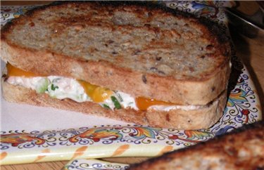 ПОДТАЯВШИЙ ТУНЕЦ? / TUNA MELT 90г консервированного тунца, воду слить, рыбу разобрать на мелкие кусочки 30 млг майонеза 2 ст ложки нарубленного сельдерея 2 ст ложки мелко нарубленного лука (любоого, я брала зелёный) 1 ст ложка нарубленной свежей петрушки 1 ч ложка лимонного сока 2 ст ложки слив.масла 4 куска цельнозернового хлеба 50 г сыра (можно Gruyere, Emmertthal, я брала чеддр) Смешать рыбу, майонез, сельдерей, лук, зелень, лимонный сок. Смазать хлеб маслом с одной стороны. На два куска хлеба (на те сторны, что с маслом) выложить салат. Сверху положить кусочки сыра. Накрыть оствшимися кусочками хлеба и поставить под верхнюю спираль на 1-2 минуты. Перевернуть, смазать маслом и зарумянить и ету сторону. Очень хорошо для летнего ужина, если к етому ещё добавить овощной суп или зелёный салат. |