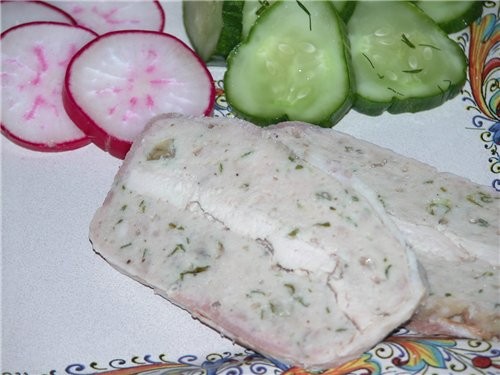 Очень нежный и вкусный террин. Может быть подан как закуска, на бутерброде или если добавить салат, то как лёгкий ужин или ланч. 8 унций бекона 13 унций куриных грудок 1 ст ложка лимонного сока 8 унций фарша из нежирной свинины 1/2 маленькой луковицы, мелко нарезанной 2 слегка взбитых яйца 2 ст л нарезанной петрушки 1 ч л соли перец Нагреть духовку до 325Ф. Тупой стороной ножа "растянуть" бекон в длину. И Выложить полосочками бекона дно и стенки 900г прямоугольную форму для хлеба (класть полосочки поперёк формы, слегка заходя друг-на-друга). 4 унции курицы нарезать на тонкие полосочки. Сбрызнуть лимонным соком и отставить в сторону. Остаок курицы прокрутить в блендере со свининой и луком до глaдкости. Добавить петрушку, соль, яйца, перец и быстро прокрутить. Выложить половину массы в форму на бекон и разровнять. Разложить сверху кусочки курицы. Выложить вторую половинку массы. Разровнять.Завернуть кусочки бекона внутрь. Закрыть форму фольгой. Поставить форму в большую форму и залить большую форму кипятком, чтобы он доходил до середины формы с мясом. Запекать 45-55 минут. Дать остыть и вынуть из формы. Подавать с листьями салата, помидорами и ломтиками лимона, чтобы выжать сверху. |
