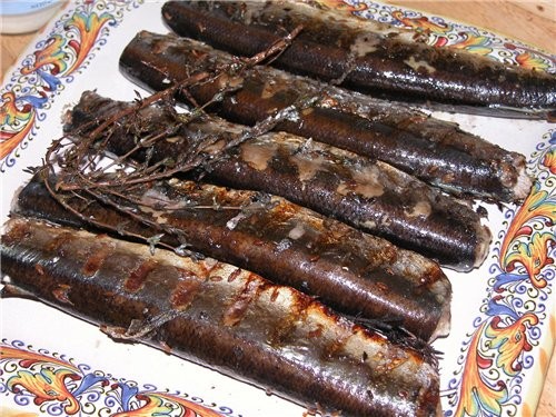 Сардин у меня не было, а была неизвестная рыбка саури (кто-нибудь знает, как ето по русски будет?) Сардины, которые я делала до етого по тому же рецепту мне понравились немного больше, а любимому, наоборот, - саури. 8 больших сардин 8 веточек лимонного тимьяна 3 ст ложки оливкового масла 2 зубчика чеснока, измельчённые 1 ч ложка лимонной цедры, измельчённой 2 ст ложки лимонного сока 1 ч ложка молотого кумина 1 ч ложка семян цумина Будем считать, что рыбка у вас уже почищена. В брюшко каждой рыбки засуньте по веточке тимьяна. И положите в один слой в неметаллическую посуду. Смешать все ингредиенты для маринада и залить рыбу. Поставить в холодильник на 2 часа. Готовить на горячем гриле 2-3 минуты на каждой стороне. |