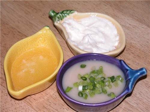 РАСПЛАВЛЕННОЕ СЛИВОЧНОЕ МАСЛО с чесноком и солью МАЙОНЕЗ С ХРЕНОМ ВИННО-ЛИМОННЫЙ СОУС Одинаковее колво лимонного сока и сухого шерри довести до кипения. И продержать на слабом кипении 6 минут. Отлить немного, добавить крахмал, корошенько перемешать и влить в общую массу. Продержать на огне помешивая до загустения. Перед подачей посыпать мелко нарезанным луком. |