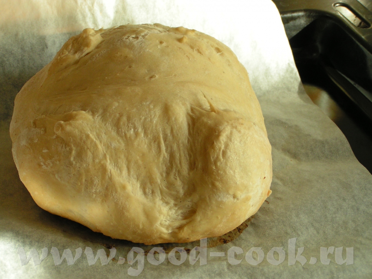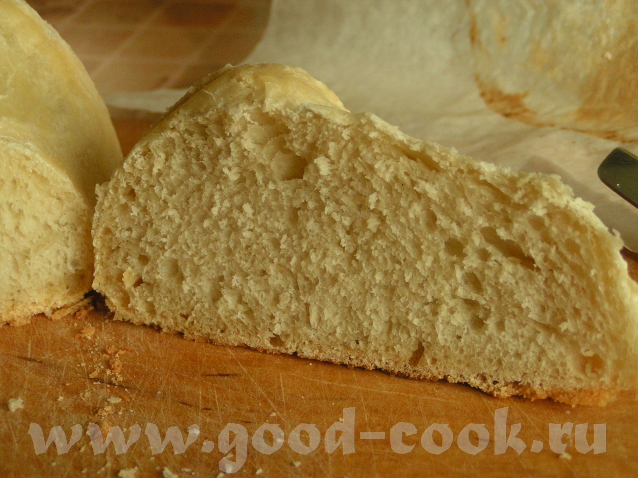 innok Инна, отчитываюсь. Заметила я, что мои эксперименты начали вызывать в домочадцах некоторое уныние, и поняла, что пора печь просто хлеб: без орехов, овсянки, помидоров и пр. А как печь, если в х-ке ждут своей очереди 3/4 теста для Фоугасе (так, кажется?). И вспомнила, что главное, не состав, а способ выпечки и форма. Короче тесто было свернуто в колобок, расстаивалось 1,5 часа (приблизительно) и пеклось минут 50 при 200 градусах С. Пекла без пара, выкладывала на горячий противень. Даю фотки:
