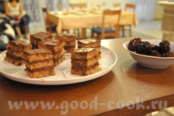 можно подавать в виде торта. Шоколадные пирожные с ромом ![]() Надо (на 16-20 порций): яйца- 5 шт. сахар- 150 г мука- 150 г какао порошок- 1 ст.л. Для крема: сахар -100 г ром- 50 мл сливки 33% - 275 мл черный шоколад- 175 г Калорийность: 172 ккал на 1 порцию Приготовление: Яйца взбить с сахаром. Добавить просеянную муку и какао. Все тщательно перемешать до однородности. Тесто вылить тонким слоем на противень, застеленный пергаментом, смазанным маслом. Выпекать в разогретой духовке 5–6 мин. при температуре 200 градусов. Приготовить еще 2 пласта. Готовое тесто остудить. Из 100 г сахара, 150 мл воды и рома приготовить сироп и пропитать им тесто. Приготовить крем. Вскипятить 100 мл сливок, снять с огня. Добавить шоколад, перемешать до однородной массы, остудить. Взбить оставшиеся сливки. Смешать их с шоколадной смесью. Полученным кремом смазать первый пласт теста. Накрыть вторым пластом, пропитать сиропом, смазать маслом, накрыть третьим пластом теста. Смазать шоколадным маслом и разрезать на порции. Готовые пирожные обсыпать сахарной пудрой. ![]() источник- "Гастроном" от меня- мне показалось, что сиропа слишком много, но я всё же использовала весь и торт не потёк, коржи прекрасно пропитались. перед тем, как поливать их сиропом, я надоткнула их много раз спичкой. крем сначала немного жидковат, но ъолоде он застывает и пироженные получаются ровные (если вы их аккуратно, не спеша готовите и режете; я конечно делала наоборот) пирожные советую подать со свежими фруктами и ягодами. |
