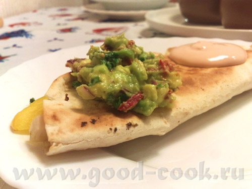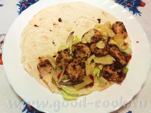 ![]() Надо (на 4 порции): Тортильи- 4 шт. Филе индейки- 250 г Конс. ананас- 4 кольца Перец чили – 1 шт. / ¼ ч.л. порошка перца чили Салат асйберг- 4 листа Сыр (гауда, эмменталь, чеддер)- 70 г Красный лук- ¼ шт. растит. масло- 1 ст.л. мексиканская приправа- несколько щепоток (факультативно) Соусы для подачи: гуакамоле сметана, смешанная с кетчупом и чили (факультативно) Приготовление: Перец чили вымыть, удалить семена, мякоть тонко нарезать. Салатные листья разорвать на крупные куски, сыр потереть. Красный лук порезать тонкими перьями. Кольца ананаса откинуть на дуршлаг, нарезать небольшими кубиками. Филе индюшатины нарезать кусочками со стороной 1-2 см. Посолить, поперчить (если не используете свежий чили, то порошком посыпьте мясо), приправить мексиканской смесью, перемешать. Разогреть в сковороде растит. масло, добавить мясо и жарить на сильном огне, помешивая, до образования корочки, около 10 мин. Выложить на одну половину тортильи красный лук, салатные листья, перец чили, ананас, пожаренную индюшатину и присыпать сыром. Накрыть второй половиной лепёшки. ![]() Поджарить на сухой сковороде (под закрытой крышкой) до зарумянивания тортильи, по 3-4 мин. С каждой стороны. Подать горячей с соусами. Примечания- вместо салата айсберг можно использавать китайскую капусту. Листья айсберга лучше брать поплотнее, те, что внутри кочана. В мою мексиканскую приправу входят крупномолотый перец и семена горчицы, хлопья чили. Сыр был только пармезан, его и использовала. |